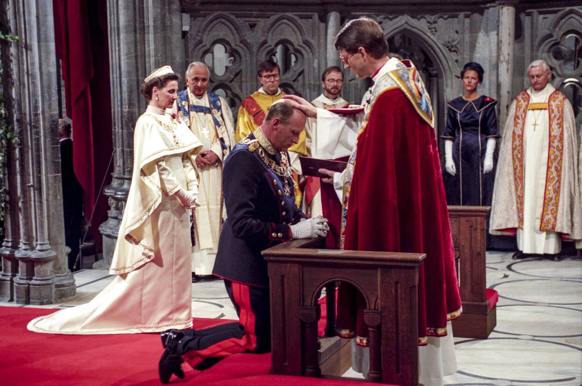 Grâce à la bénédiction royale, le couple royal a poursuivi une tradition introduite par le roi Olav en 1958. Au cours de la cérémonie, le roi Harald a été consacré en tant que «roi de la volonté du peuple», ce qui diffère de la coutume de couronner le roi – qui a été supprimée. de la Constitution de 1908.