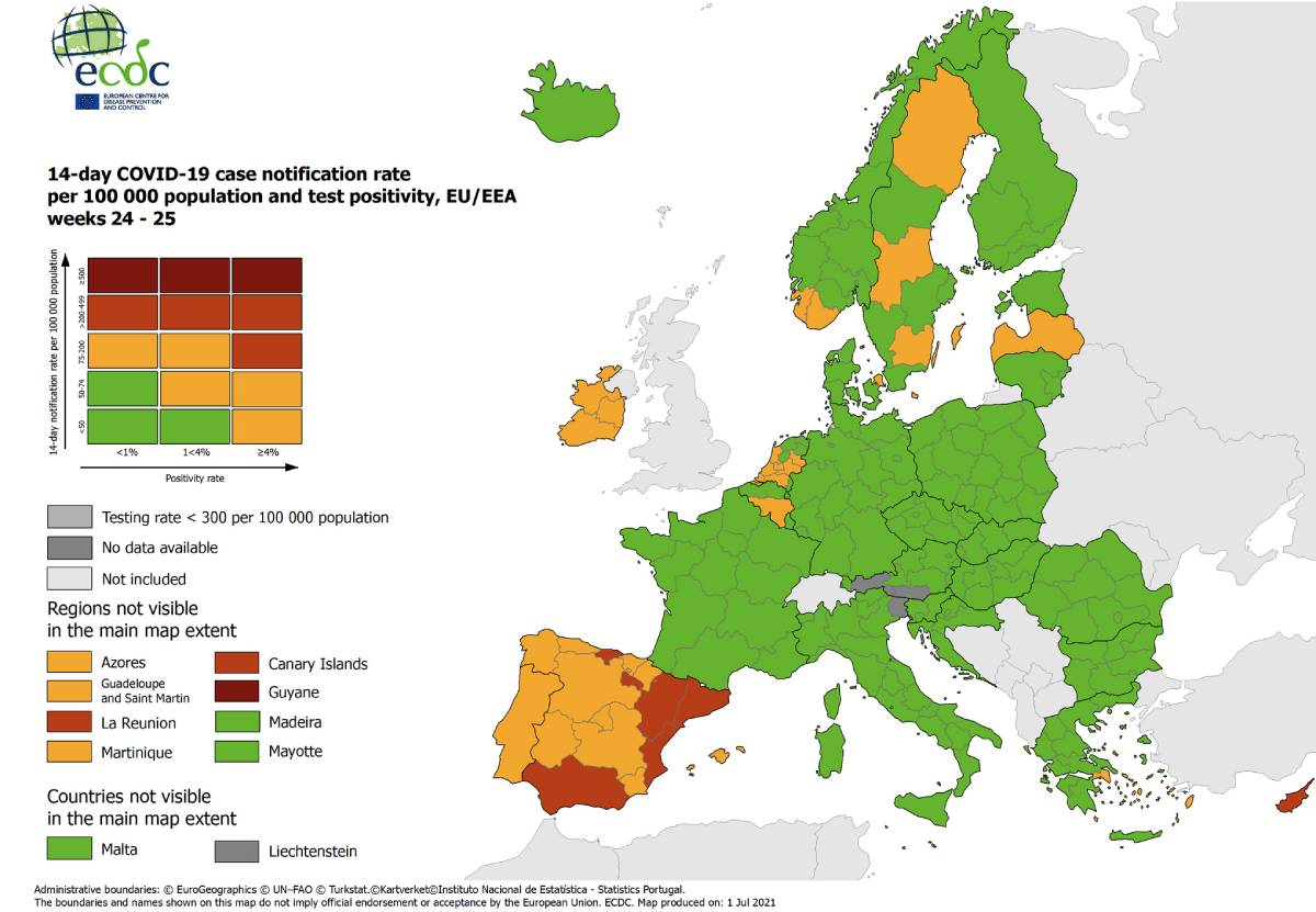 Les pays qui sont complètement ou presque complètement « verts » sur la carte ECDC sont l’Islande, la Finlande, le Danemark, l’Estonie, la Lituanie, la Pologne, l’Allemagne, le Liechtenstein, la France, l’Italie, Malte, la Croatie, la Slovénie, l’Autriche, la République tchèque, la Slovaquie, Hongrie, Roumanie, Bulgarie et Grèce.