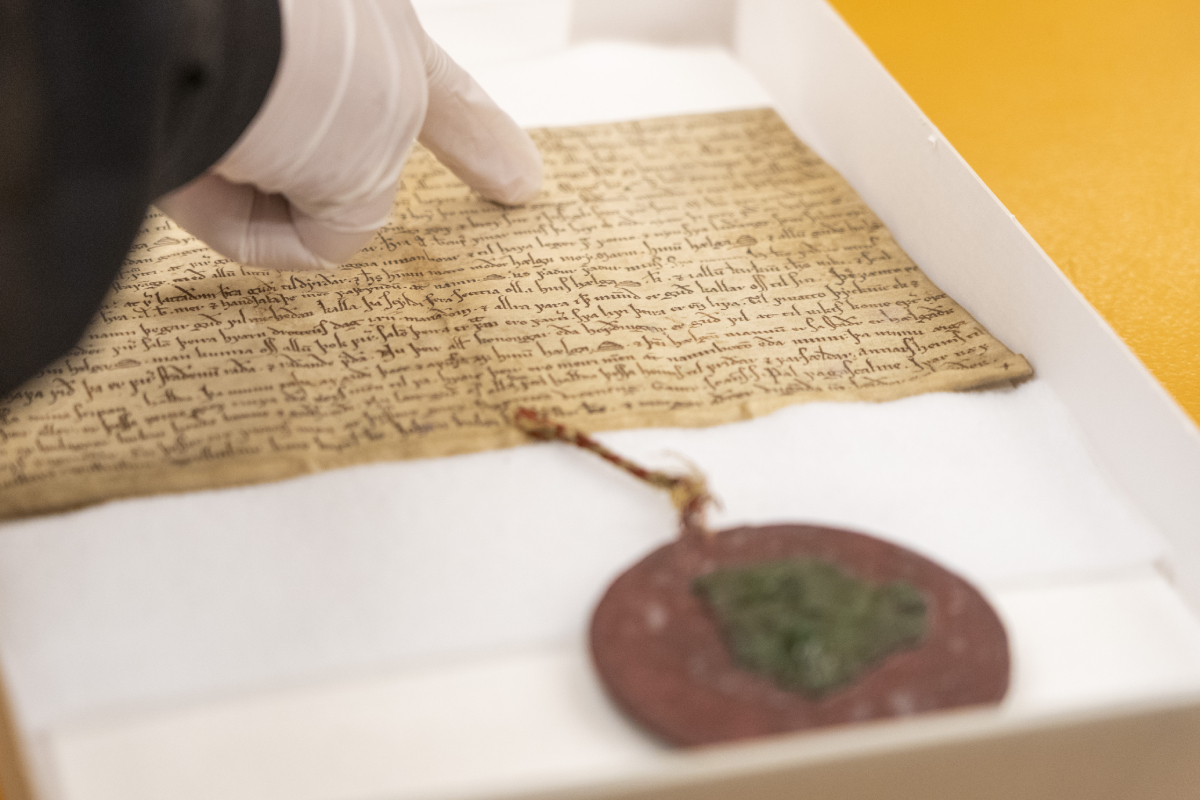 Le prince héritier Haakon visite les Archives nationales de Norvège à Sognsvann à Oslo. Sur la photo, un vieux document contenant les noms Haakon, Sverre et Magnus. Photo : Terje Pedersen / NTB