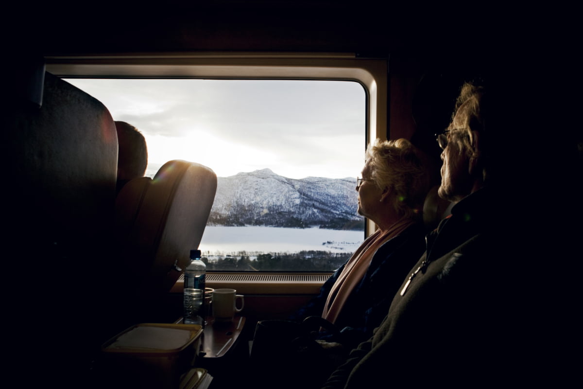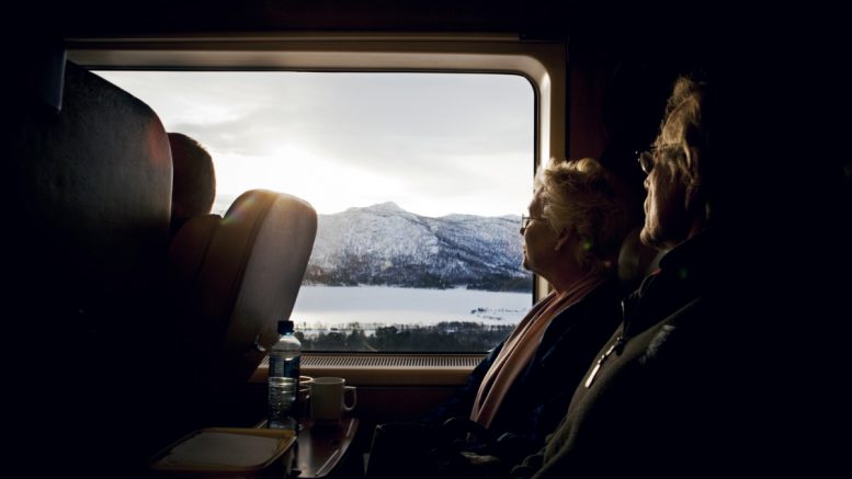 La ligne Bergen a 100 ans vendredi. Cette photo a été prise juste au sud de Gol sur le chemin de Bergen et montre deux passagers profitant de la vue. Photo: Tore Meek / NTB