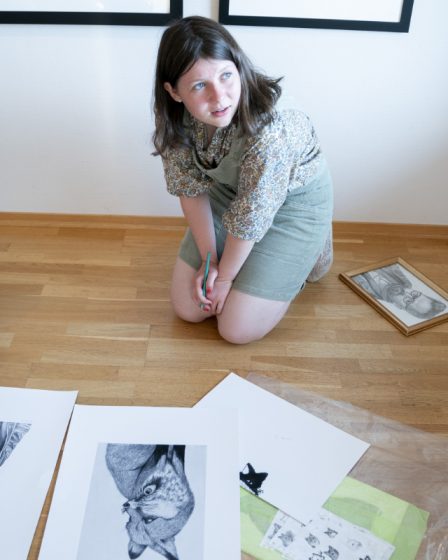 Maud Angelica Behn signe le dessin qu’elle a réalisé de son père Ari Behn lors d’une présentation d’une exposition des …